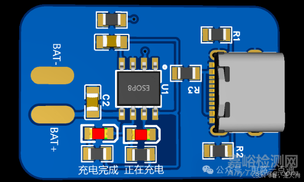 在實際電路設計中可以將,R1 R2 NTC(熱敏電阻)省略掉,而BAT引腳需要連接電池的正極,這個正極可以自己繪制焊盤或者用排針孔來焊接電源正極跟負極,同事需要注意的是5V的輸入電壓是串聯一個0.3歐姆的輸入電阻的。