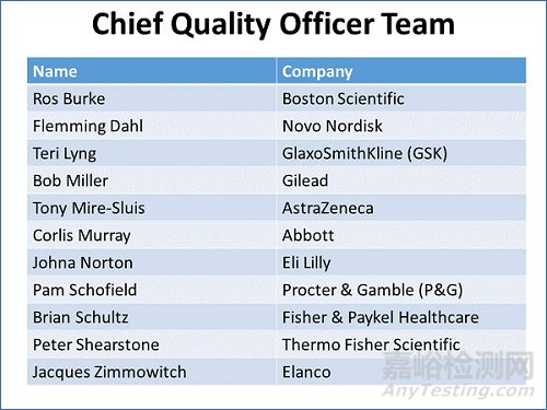 為了解決質(zhì)量部門(mén)似乎存在的系統(tǒng)問(wèn)題,Phillips邀請(qǐng)了幾位跨國(guó)公司的質(zhì)量負(fù)責(zé)人組建調(diào)研團(tuán)隊(duì)(如下表)。該團(tuán)隊(duì)的目的是“與所有利益相關(guān)方合作推動(dòng)行業(yè)未來(lái)的前沿解決方案。”它計(jì)劃“重新設(shè)計(jì)質(zhì)量領(lǐng)域,使公司對(duì)所有利益相關(guān)者的價(jià)值最大化”