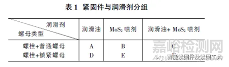 為了測定緊固件的扭矩系數(shù),試驗選用鍍鋅六角螺栓作為樣件,螺栓規(guī)格M12,等級10.9 級,分別匹配M12 的鍍鋅六角螺母和六角鎖緊螺母進行扭矩系數(shù)試驗,同時潤滑劑選用潤滑油、MoS2 噴劑和潤滑油+MoS2 三種進行對比,其中MoS2 噴劑成分為MoS2 和可揮發(fā)的溶劑,在噴涂后會快速消失僅存留MoS2。試樣分組與選樣如表1 所示。試驗采用軸向力測試儀進行,通過卡板固定螺栓頭部,并用一定的扭矩分多次扳手擰緊螺母,最高扭矩100Nm,利用軸向力測試儀中的傳感器記錄不同扭矩擰緊后的預緊力,以此計算扭矩系數(shù),每一組測10 套緊固件。