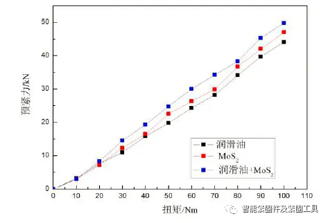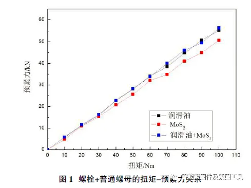 圖1 所示為螺栓+普通螺母采用不同潤滑劑所獲得的預緊力-扭矩關系,可以看出,采用不同潤滑劑的螺紋副在擰緊過程中,預緊力與扭矩之間比較符合線性關系,但是在同樣使用100Nm 扭矩擰緊時,采用不同潤滑劑擰緊所獲得的預緊力有所區(qū)別,采用MoS2 噴劑時預緊力最低,為50.7kN,低于其余兩組,其中采用潤滑油獲得預緊力為55.2kN,采用潤滑油+MoS2 噴劑作為潤滑介質獲得預緊力為56.3kN。