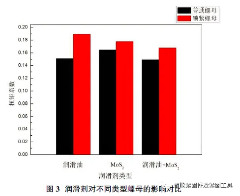 1)對于普通螺母,潤滑油類流體潤滑效果優(yōu)于MoS2類的固體潤滑效果,而對于鎖緊螺母則相反;