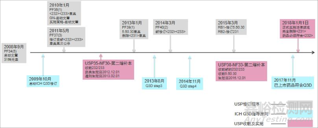 USP官網(wǎng)元素雜質(zhì)更新專(zhuān)欄[16]列出USP實(shí)施ICH Q3D的詳細(xì)歷程,感興趣者可以參考學(xué)習(xí),由于這一歷程較為復(fù)雜,以下僅對(duì)關(guān)鍵節(jié)點(diǎn)(圖 2)做簡(jiǎn)要的解讀和分析。