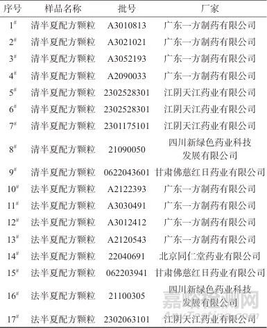 市場(chǎng)上,目前有清半夏、法半夏、姜半夏,以及竹瀝半夏4種半夏炮制品生產(chǎn)的配方顆粒。實(shí)驗(yàn)應(yīng)用布魯克近紅外光譜對(duì)收集到的5家企業(yè)的17批樣品進(jìn)行測(cè)定。其中,其中清半夏配方顆粒9批,法半夏配方顆粒8批,樣品信息見(jiàn)表1。