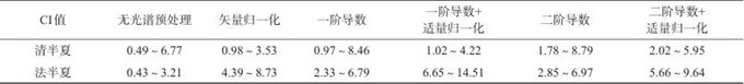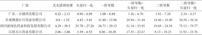 在無(wú)光譜預(yù)處理及5種光譜預(yù)處理方法下,不同廠家清半夏配方顆粒的CI值范圍見(jiàn)表2。由表2可知,選用一階導(dǎo)數(shù)+矢量歸一化光譜預(yù)處理技術(shù)后,廣東一方制藥有限公司清半夏配方顆粒的CI值在1.26~6.70范圍內(nèi),江陰天江藥業(yè)有限公司清半夏配方顆粒的CI值為在17.55~22.67范圍內(nèi),甘肅佛慈紅日藥業(yè)有限公司清半夏配方顆粒的CI值在28.94~31.44范圍內(nèi),四川新綠色藥業(yè)科技發(fā)展有限公司清半夏配方顆粒的CI值在51.34~53.95范圍內(nèi),該技術(shù)下CI值差距最大,即選用一階導(dǎo)數(shù)+矢量歸一化預(yù)處理技術(shù)結(jié)合合格性測(cè)試得到的最優(yōu)模型,能夠?qū)η灏胂牟煌瑥S家的配方顆粒進(jìn)行有效地區(qū)分,這可能由于該光譜預(yù)處理放大了不同廠家清半夏配方顆粒之間的差異性信息,消除了由于光程變化等對(duì)光譜產(chǎn)生的影響,提高了所建模型的預(yù)測(cè)能力,模型判別正確率為100%。