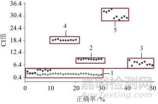 炮制方法不同的半夏配方顆粒合格性測(cè)試模型見(jiàn)圖4。從圖4中可直觀地看出,不同炮制方法半夏配方顆粒的CI值存在明顯差異。