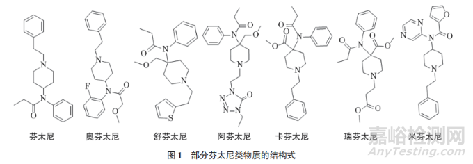 芬太尼類物質(zhì)是指與芬太尼[N-[1(-2-苯乙基)-4-哌啶基 ]-N-苯基丙酰胺 ] 具有相似的母核結(jié)構(gòu),同時(shí)符合表1中一個(gè)或多個(gè)結(jié)構(gòu)修飾條件的物質(zhì)。芬太尼及其常見衍生物,如舒芬太尼、阿芬太尼等,均屬于4-苯胺基哌啶類化合物,這些化合物通常以N-苯乙基-4-哌啶酮和4-苯胺基-N-苯乙基哌啶為前體,通過化學(xué)反應(yīng)衍生。常用于臨床的部分芬太尼類物質(zhì)的結(jié)構(gòu)式如圖1。