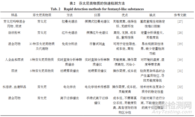 目前芬太尼類物質(zhì)的檢測(cè)方法有高效液相色譜法、液相色譜 -串聯(lián)質(zhì)譜法、氣相色譜-質(zhì)譜法等,這些方法靈敏度高、結(jié)果準(zhǔn)確,但樣品前處理過程復(fù)雜、檢測(cè)周期較長,無法滿足現(xiàn)場(chǎng)監(jiān)管快速檢測(cè)的需求。近年來,出現(xiàn)了基于便攜式分析儀器的快速檢測(cè)方法,僅需幾微克的樣品便可快速篩查芬太尼類物質(zhì),操作簡單,幾乎不需要前處理,對(duì)實(shí)現(xiàn)快速檢測(cè)芬太尼類物質(zhì)具有重大意義,表2列舉了芬太尼類物質(zhì)的快速檢測(cè)方法。