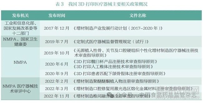 在3D 打印醫(yī)療器械方面,2017 年12 月,工業(yè)和信息化部、國家發(fā)展改革委等十二部門聯(lián)合印發(fā)《增材制造產(chǎn)業(yè)發(fā)展行動計(jì)劃(2017-2020 年)》, 提出要建立“3D 打印+ 醫(yī)療”的示范應(yīng)用。2019 年6 月,3D 打印醫(yī)療器械專業(yè)委員會公布了《3D 打印醫(yī)療器械團(tuán)體標(biāo)準(zhǔn)(第一冊)》。2019 年7 月,國家藥品監(jiān)督管理局(National Medical Products Administration,NMPA) 和國家衛(wèi)生健康委員會聯(lián)合發(fā)布《定制式醫(yī)療器械監(jiān)督管理規(guī)定(試行)》,旨在規(guī)范定制式醫(yī)療器械注冊監(jiān)督管理,保障其安全性、有效性,滿足患者個性化需求。2019 年以來,NMPA 及醫(yī)療器械技術(shù)審評中心發(fā)布多項(xiàng)3D 打印醫(yī)療器械相關(guān)指導(dǎo)原則,指導(dǎo)申請人進(jìn)行相關(guān)產(chǎn)品注冊申報,以促進(jìn)3D 打印醫(yī)療器械的研發(fā)上市。我國3D 打印醫(yī)療器械主要相關(guān)政策見表3。在3D 打印藥物方面,我國尚未出臺專門的政策文件。