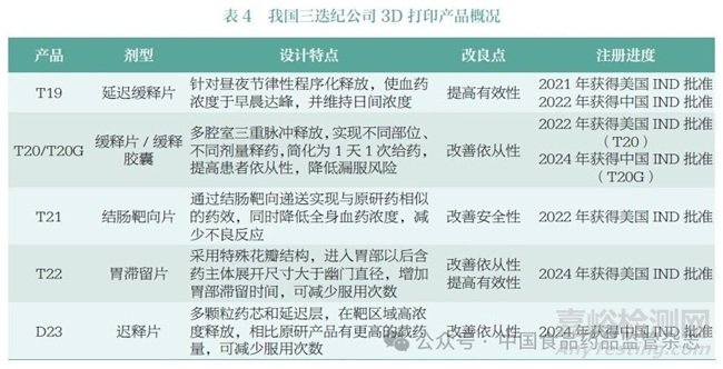目前,3D 打印藥物公司和活躍研究機(jī)構(gòu)主要分布在歐洲、美國和中國,研究階段按照技術(shù)成熟度及應(yīng)用方向可分為藥物早期概念研究、個性化給藥以及商業(yè)化開發(fā)[13]。全球范圍內(nèi),3D 打印藥物領(lǐng)域的大多數(shù)機(jī)構(gòu)尚處于早期概念研究階段。個性化給藥方面,主要參與者包括英國阿斯利康、荷蘭應(yīng)用科學(xué)研究機(jī)構(gòu)TNO 和3 家專業(yè)3D 打印藥物公司FabRx、Multiply Labs 和DiHeSys。商業(yè)化開發(fā)方面,全球范圍內(nèi)將3D 打印技術(shù)應(yīng)用于商業(yè)化開發(fā)階段的僅有2 家公司,分別為美國Aprecia 公司和中國三迭紀(jì)公司;此外,美國默沙東和德國默克等跨國藥企也在研發(fā)探索中[14]。產(chǎn)品方面,全球已上市3D 打印藥物為美國Aprecia公司開發(fā)的左乙拉西坦口崩速釋片( 商品名:Spritam®)。中國三迭紀(jì)公司有5 款產(chǎn)品已經(jīng)獲批新藥臨床試驗(yàn)(investigational new drug,IND) 申請。其中,T19、T20、T21、T22 已獲得美國FDA 的IND 批準(zhǔn),T19、T20G、D23 已獲得我國IND 批準(zhǔn)。中國三迭紀(jì)公司3D 打印產(chǎn)品概況具體見表4。
