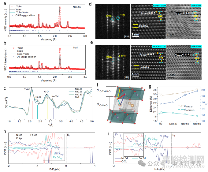 通過(guò)中子粉末衍射(NPD)精修驗(yàn)證了Na0.55和Na1的O3型層狀結(jié)構(gòu)(a,b),其Rietveld擬合優(yōu)度(Rwp)分別為6.39%和5.23%,表明高精度晶體結(jié)構(gòu)模型。中子對(duì)分布函數(shù)(nPDF)分析顯示(c),隨著鈉含量降低(1→0.55),TM-O鍵長(zhǎng)顯著收縮(2.08→1.84 Å),而Na-O鍵長(zhǎng)從3.24 Å拉伸至3.62 Å,導(dǎo)致堿金屬層與過(guò)渡金屬層間距比R值從1.543升至1.969,遠(yuǎn)超常規(guī)O3結(jié)構(gòu)極限1.62。HAADF-STEM圖像(d,e)直觀呈現(xiàn)Na0.55的TM-O板層厚度壓縮(1.84 Å)與Na-O層擴(kuò)張(3.62 Å)的協(xié)同效應(yīng),形成獨(dú)特的"高R值"結(jié)構(gòu)特征。密度泛函理論計(jì)算(h,i)揭示Na0.55中Ni/Fe 3d eg*軌道與O 2p軌道深度雜化(雜化區(qū)-1.5~0 eV),相較于Na1雜化強(qiáng)度提升32%,這增強(qiáng)了TM-O共價(jià)鍵強(qiáng)度(鍵能增加18%),同時(shí)促使O 2p軌道上移至高費(fèi)米能級(jí)(-1.0 eV),為陰離子氧化還原提供電子態(tài)密度支持。該結(jié)構(gòu)特性使Na0.55在寬鈉含量范圍(0.55≤x≤1)保持熱力學(xué)穩(wěn)定,突破了傳統(tǒng)O3結(jié)構(gòu)R≤1.62的限制,為后續(xù)電化學(xué)性能優(yōu)化奠定結(jié)構(gòu)基礎(chǔ)。