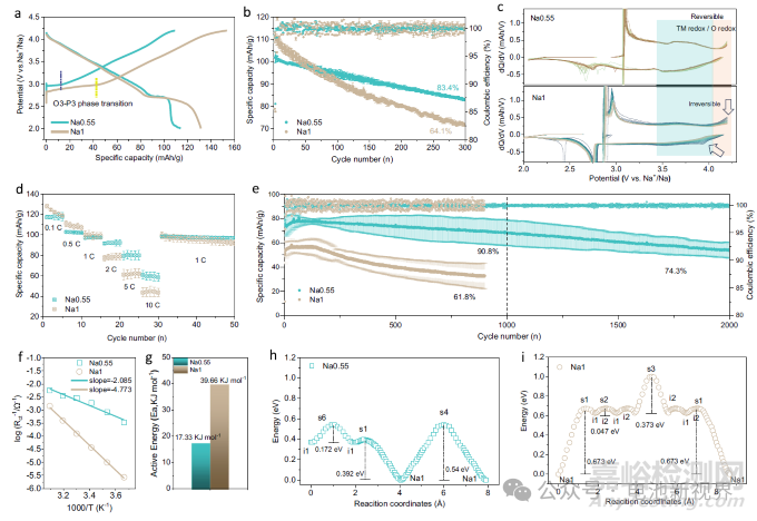 Na0.55與Na1在0.1C倍率下分別展現(xiàn)117.3 mAh/g和132.6 mAh/g的初始容量,但循環(huán)穩(wěn)定性差異顯著:Na0.55在1C倍率下300次循環(huán)后容量保持率達(dá)83.4%,較Na1(64.1%)提升29.6%。高倍率性能方面,Na0.55在5C和10C下分別提供80.6 mAh/g和60.2 mAh/g容量,較Na1提升34.3%和30.9%。動(dòng)力學(xué)分析顯示,Na0.55的電荷轉(zhuǎn)移活化能僅為Na1的43.6%,且Na+遷移能壘(0.54 eV)較Na1(0.673 eV)降低19.8%,這與其高R值結(jié)構(gòu)促進(jìn)的快速O3-P3相變(相變體積變化率ΔV=1.2% vs. Na1的1.28%)和拉伸鈉層間隙四面體通道密切相關(guān)。dQ/dV曲線(xiàn)(圖2c)進(jìn)一步揭示Na0.55在3.4-4.2 V區(qū)間保持高度可逆的TM/O氧化還原活性,而Na1的氧化還原峰在100次循環(huán)后衰減62%,歸因于高R值增強(qiáng)的TM3d eg* O2p軌道雜化(雜化強(qiáng)度提升32%)抑制了陽(yáng)離子遷移。長(zhǎng)期循環(huán)中,Na0.55的放電中值電壓保持率(96.5%)顯著高于Na1(91.8%),印證了高R值結(jié)構(gòu)對(duì)晶格瞬時(shí)形變速率的調(diào)控作用。