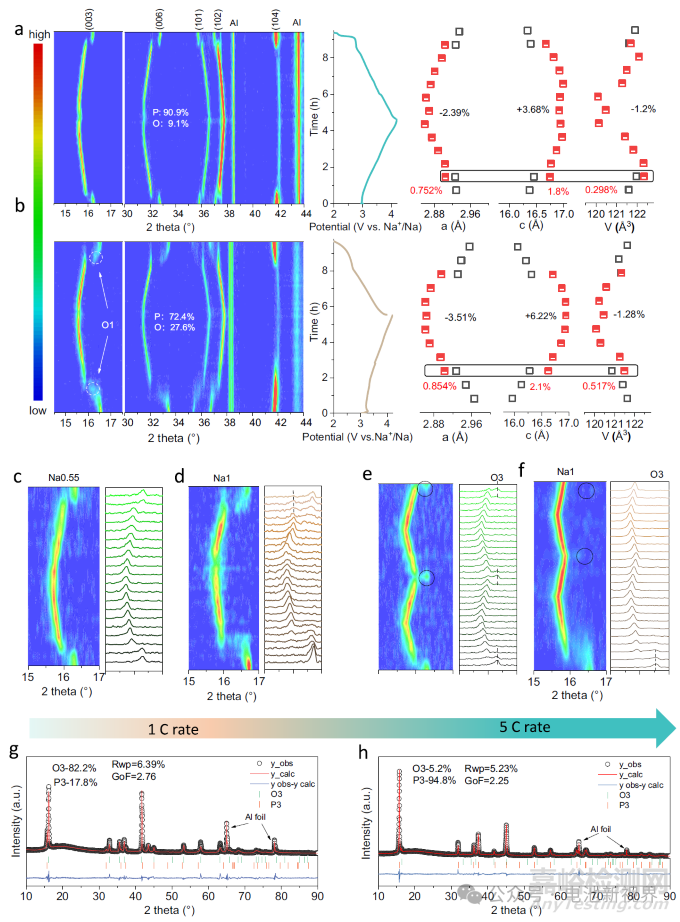 原位XRD表征顯示Na0.55在充電過(guò)程中僅需脫出0.04 mol Na+即可快速完成O3-P3相變(圖3a),而Na1則需經(jīng)歷O3→O'3→P3的多步相變(圖3b),且伴隨1.28%的體積收縮(Na0.55為1.2%)。晶格參數(shù)分析表明,Na0.55在相變過(guò)程中呈現(xiàn)雙相共存(O3/P3),其晶胞參數(shù)失配度(Δa=0.752%,Δc=1.8%)顯著低于Na1的雙相失配(Δa=0.854%,Δc=2.1%),這得益于其高R值結(jié)構(gòu)預(yù)先處于相變預(yù)備態(tài),降低了晶格瞬時(shí)形變速率。高倍率循環(huán)測(cè)試中(圖3c-h),Na0.55在5C倍率下經(jīng)3次循環(huán)后仍保留82.2%的O3相,而Na1在首次循環(huán)后即出現(xiàn)94.8%的不可逆P3相,驗(yàn)證了高R值(1.969)通過(guò)促進(jìn)快速平滑相變提升結(jié)構(gòu)可逆性的機(jī)制。電荷轉(zhuǎn)移活化能分析(圖2g)進(jìn)一步支持這一結(jié)論,Na0.55的活化能(17.33 kJ/mol)僅為Na1(39.66 kJ/mol)的43.6%,表明其相變過(guò)程能量勢(shì)壘顯著降低。