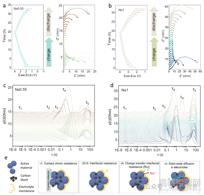 通過(guò)三電極軟包電池系統(tǒng)的原位電化學(xué)阻抗譜(圖4a,b)與分布弛豫時(shí)間(DRT)分析(圖4c,d)揭示了高R值結(jié)構(gòu)對(duì)相變動(dòng)力學(xué)的調(diào)控機(jī)制。Na0.55在充電過(guò)程中電荷轉(zhuǎn)移阻抗(τ4)峰向高頻移動(dòng)且峰值強(qiáng)度快速衰減,對(duì)應(yīng)其快速的O3-P3相變過(guò)程(相變起始電壓3.2 V,完成僅需脫出0.04 mol Na+),而Na1的τ4峰衰減幅度較小且放電末期出現(xiàn)新的τ4'峰,表明存在27.6%不可逆相界面殘留。DRT解析顯示Na0.55的體相擴(kuò)散阻抗(τ5)在充放電過(guò)程中保持對(duì)稱(chēng)性,而Na1的τ5峰在放電末期展寬至1.8 decade,印證其結(jié)構(gòu)畸變積累。這種差異源于高R值(1.969)使Na0.55的O3相預(yù)先處于相變預(yù)備態(tài),將電荷轉(zhuǎn)移活化能降低至17.33 kJ/mol(Na1為39.66 kJ/mol),從而通過(guò)平滑的相變路徑(晶胞參數(shù)失配度Δa=0.752%,Δc=1.8%)抑制了瞬時(shí)晶格應(yīng)變速率(0.28%/min vs Na1的0.35%/min)。