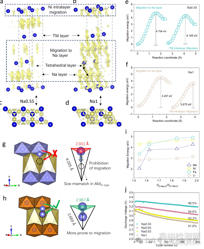 通過(guò)鍵價(jià)路徑分析揭示高R值結(jié)構(gòu)對(duì)陽(yáng)離子遷移的抑制作用,Na0.55中Ni的層內(nèi)遷移能壘(4.145 eV)和向鈉層間隙四面體位點(diǎn)遷移能壘(4.704 eV)分別較Na1(3.675 eV和4.297 eV)提升12.8%和9.5%。結(jié)構(gòu)分析表明,高R值(1.969)通過(guò)三重機(jī)制抑制遷移:首先,TM-O板片收縮使Ni/Fe 3deg*-O 2p軌道雜化增強(qiáng),Ni-O鍵能提升(鍵長(zhǎng)縮短0.036 Å);其次,鈉層間隙四面體通道的O-O平面間距從Na1的2.967 Å收縮至2.931 Å,導(dǎo)致遷移路徑有效截面積減少5.8%;第三,遷移后的TM-O在拉伸四面體結(jié)構(gòu)中形成鍵角張力(增加12°),導(dǎo)致體系內(nèi)能升高。遷移能壘分布顯示(圖5i),Mn、Fe、Ni、Li在Na0.55~Na1系列中的遷移能壘均與R值呈正相關(guān),其中Ni在R=1.969時(shí)的遷移能壘較R=1.543提升32.7%。電化學(xué)驗(yàn)證表明(圖5j),Na0.55在1C倍率下200次循環(huán)后放電中值電壓保持率達(dá)96.5%,顯著高于Na1的91.8%,這與原位拉曼光譜顯示的Na0.55表面層狀相信號(hào)穩(wěn)定性(衰減<2%)相印證。
