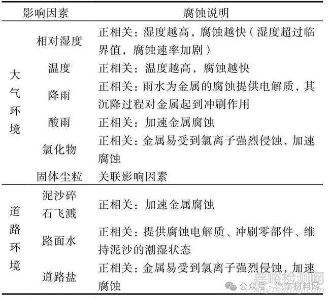 環(huán)境是影響整車腐蝕速率的重要外部因素[6],因而需要在整車防腐性能目標設(shè)定及指標分解時予以充分考慮,各項環(huán)境因子對腐蝕的影響說明如表1所示。充分考慮全球大氣環(huán)境與道路條件對整車腐蝕的影響,一般可將全球200多個國家和地區(qū)劃分為輕微、中等與嚴重共計三種腐蝕等級;其中,中國、東盟與非洲等屬于輕微腐蝕等級,非歐盟國家及東歐地區(qū)、中美洲、南美洲、大洋洲、中東地區(qū)等屬于中等腐蝕等級,歐盟、英國與北美洲等屬于嚴重腐蝕等級。車型設(shè)計開發(fā)時,應(yīng)充分考慮車輛銷售市場的環(huán)境腐蝕等級,并基于腐蝕環(huán)境條件最嚴苛的原則設(shè)定整車防腐目標,以確保開發(fā)車型滿足所有銷售市場的防腐需求。
