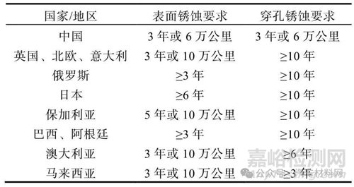 隨著整車腐蝕問題頻發(fā),以及消費者對車輛腐蝕性能關(guān)注度的日益提升, 2013年10月1日,國家質(zhì)量監(jiān)督檢驗檢疫總局出臺了《家用汽車產(chǎn)品修理、更換、退貨責任制規(guī)定》,規(guī)定國內(nèi)生產(chǎn)、銷售家用汽車產(chǎn)品的修理、更換、退貨(簡稱“三包”)責任。明確規(guī)定家用汽車產(chǎn)品的包修期限不低于3年或行駛里程6萬公里,以先到為準。為了提升車型的市場競爭力,車企在 “三包”手冊中給定的整車防腐質(zhì)保期限往往會高于“三包”基本要求。閆會杰等[4]調(diào)研了國內(nèi)外乘用車防腐基本要求,結(jié)果見表2。