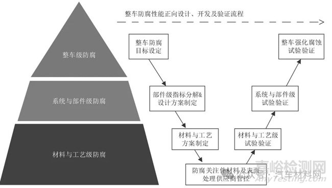 整車防腐性能正向設(shè)計開發(fā)與驗證可遵循頂層設(shè)計、逐級分解,由點到面的管控原則,以實現(xiàn)目標達成并從根源上規(guī)避因設(shè)計原因而產(chǎn)生的腐蝕問題。筆者結(jié)合多個車型防腐性能設(shè)計開發(fā)與驗證工作經(jīng)驗,提出整車防腐性能“金字塔”模型和“V字形”工作推進策略,詳細參見圖1。其核心工作思路與流程可分為:整車防腐目標設(shè)定—系統(tǒng)與部件防腐性能指標分解(形成防腐件管控清單)—系統(tǒng)與部件防腐方案設(shè)計(結(jié)構(gòu)、材料與工藝)—防腐關(guān)注件材料及表面處理供應(yīng)商管控—材料與工藝級防腐性能驗證—系統(tǒng)與部件防腐設(shè)計驗證—整車強化腐蝕試驗驗證。結(jié)合整車開發(fā)流程將防腐性能管控拆分為整車、系統(tǒng)與部件、材料與工藝三個層級,三者互為支撐且環(huán)環(huán)相扣,構(gòu)建起整車防腐性能正向設(shè)計開發(fā)與驗證的工作體系。