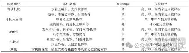 表3 白車身腐蝕風險等級劃分及典型零件選材建議