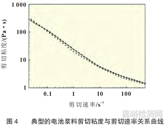 大多數(shù)鋰離子電極漿料具有剪切變稀的特性,如圖4所示,剪切粘度隨剪切速率的增大而減小。這種特性在固體含量較高的漿料中更為明顯。在較高的剪切速率下,強(qiáng)剪切力會(huì)破壞材料之間形成的網(wǎng)絡(luò)結(jié)構(gòu),使顆粒重新排列成更有序的平行于剪切場(chǎng)的結(jié)構(gòu),導(dǎo)致粘度下降,在較高的剪切速率下達(dá)到牛頓平臺(tái)。