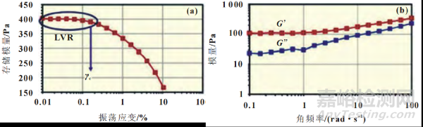 粘彈性一般采用流變儀來(lái)測(cè)量。通過(guò)施加小振幅的振動(dòng)剪切力如振幅掃描和頻率掃描來(lái)測(cè)量漿料的粘彈性。這些測(cè)試輸出存儲(chǔ)模量G'(又稱彈性模量)和損耗模量G''(又稱粘性模量)。G'是指材料發(fā)生形變時(shí)由于彈性儲(chǔ)存的能量值,是材料彈性的定量;G''則是材料發(fā)生形變時(shí)損耗的能量,是物質(zhì)粘性性質(zhì)的量化。G''和G'相等時(shí),表示此時(shí)漿料流變性質(zhì)發(fā)生變化,由固態(tài)轉(zhuǎn)變?yōu)橐簯B(tài)或由液態(tài)轉(zhuǎn)變?yōu)楣虘B(tài)。交點(diǎn)處的頻率或震蕩角頻率,其值越小則說(shuō)明特性時(shí)間越長(zhǎng),流體趨向于粘性流體(漿料分散態(tài)),其值越大越說(shuō)明流體趨向于彈性(凝膠態(tài)),表示漿料沒(méi)有達(dá)到很好的分散程度。圖5是典型的振幅掃描與頻率掃描圖。