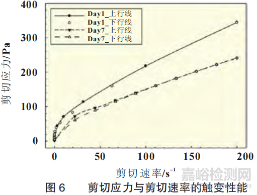 對(duì)以鈷酸鋰、炭黑、聚偏氟乙烯構(gòu)成的正極漿料,施加從0~200s-1線性增加的剪切速率,之后再線性減小至0s-1,其結(jié)果如圖6所示,曲線并沒(méi)有形成閉環(huán),說(shuō)明漿料在剪切作用下發(fā)生了不可逆破壞。