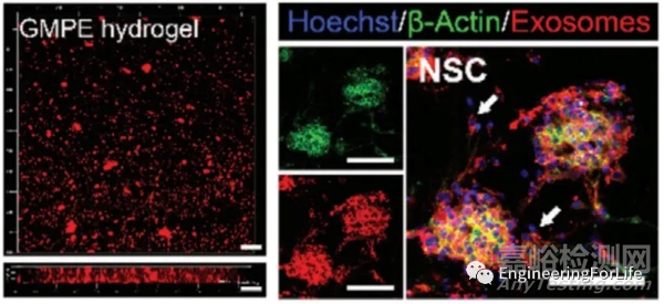 圖3 PKH26熒光標(biāo)記外泌體在GelMA-PPY-Exosomes (GMPE)水凝膠及神經(jīng)干細(xì)胞細(xì)胞質(zhì)的可視化分布[4]