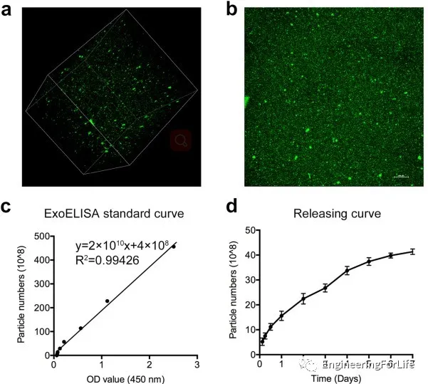 圖5 PKH67標(biāo)記GelMA凝膠中HUVECs-Exos及ELISA法測試GelMA水凝膠中Exos的釋放曲線[8]