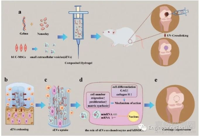 研究結(jié)果:GelMA/nanoclay水凝膠持續(xù)釋放sEV,具有刺激軟骨形成和治愈軟骨缺損的能力,在治療軟骨缺損方面具有廣闊的前景[5]。