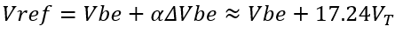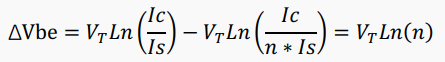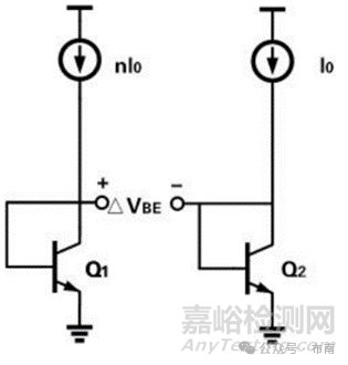 2.如果兩個(gè)BJT的集電極電流Ic相同(集電極和發(fā)射極短接的情況下),但是發(fā)射極面積不同,Q2是Q1的n倍。那么他們Vbe之間的壓差ΔVbe也是一個(gè)與溫度正相關(guān)的電壓。