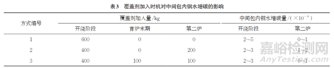 中間包覆蓋劑是在連鑄開澆階段,當大包向中間包注入的鋼水達到一定限位時,往中間包內(nèi)加入的一種覆蓋材料,主要作用為隔絕鋼水與空氣接觸,防止鋼液二次氧化。中間包覆蓋劑根據(jù)所澆鑄的鋼種不同,通常設(shè)計上也會存在較大差異。常規(guī)鋼種的覆蓋劑組成為基礎(chǔ)渣料與碳化稻殼,其中碳化稻殼的主要特點為熔化快、覆蓋性強,能夠使所加入的覆蓋劑起到更好的保溫效果。但是,碳化稻殼中碳含量較高,使用過程通常會引起中間包內(nèi)鋼水增碳,對于碳含量極低的鋼種,盡管該部分增碳只發(fā)生在開澆初期,但含碳量影響鋼水最終澆鑄成板坯,仍會對最終成品的性能帶來極大影響。因此,碳元素質(zhì)量分數(shù)不大于0.01%的超低碳鋼往往使用專用覆蓋劑,例如無取向電工鋼所選用的覆蓋劑通常不含有碳化稻殼,其自由碳質(zhì)量分數(shù)一般不大于0.5%,以減少碳的帶入。同時,調(diào)整覆蓋劑的投入時機,將開澆階段投入的覆蓋劑總量降低改為在首爐末期或第二爐階段進行覆蓋劑補充,也可減少開澆期的鋼水增碳,覆蓋劑加入時機對中間包內(nèi)鋼水增碳的影響如表3所示。