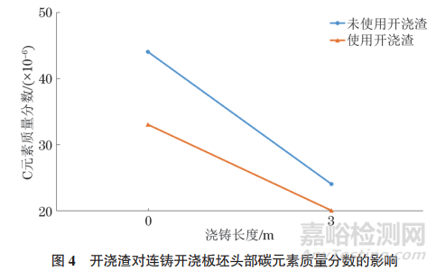與使用保護渣進行結(jié)晶器內(nèi)鋼液開澆不同,開澆渣的熔點極低,與鋼水接觸時,開澆渣可以快速熔化形成熔渣層并活躍液面,不僅可以減少鑄坯增碳量,同時也可以防止結(jié)晶器液面結(jié)冷鋼產(chǎn)生滯坯等情況。開澆渣對連鑄開澆板坯頭部碳元素質(zhì)量分數(shù)的影響如圖4所示,實際生產(chǎn)實踐中,使用開澆渣可降低開澆階段板坯的碳元素質(zhì)量分數(shù),為(4~11)×10−6。