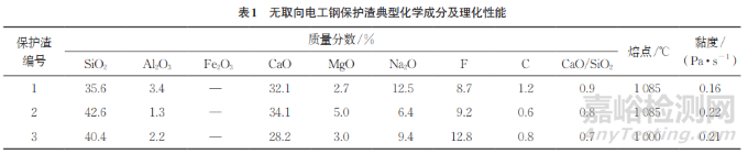 結(jié)晶器保護渣是連鑄生產(chǎn)必不可少的輔助材料,對鑄坯質(zhì)量和產(chǎn)量起著至關(guān)重要的作用。選取3種不同成分、熔點以及黏度的無取向電工鋼保護渣,分別編號為1,2,3號,其化學成分及理化性能如表1所示。在3個中間包的首爐使用此3類保護渣澆鑄相同鋼種,對開澆第一塊板坯(B坯)按照固定長度進行切割取樣,利用碳硫分析儀對試樣中的C元素含量進行分析。為盡可能減小試驗誤差,對其他可能造成鋼水增碳的因素在試驗設(shè)計上進行了限制,如開澆長水口、中間包涂層、浸入式水口等均使用同一廠家、相同批次的材料。此外,工藝條件上開澆投入覆蓋劑總量固定為600kg,連鑄機兩流開澆目標提升拉速恒定為1.4m/min,過熱度為25℃,連鑄初始C元素質(zhì)量分數(shù)為0.0019%。
