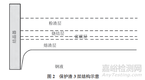 保護渣中的自由碳含量通常是影響板坯增碳的主要因素之一,從圖1中3種保護渣影響板坯增碳的結(jié)果看,并不是保護渣中的自由碳含量越低,板坯的增碳量就越少。碳在保護渣中的作用主要為熔速調(diào)節(jié),無取向電工鋼保護渣中通??偺荚刭|(zhì)量分數(shù)為2%~4%。適當控制保護渣的熔化速率,會在結(jié)晶器液面上形成3層結(jié)構(gòu)(見圖2),從上到下依次為粉渣層、燒結(jié)層和熔渣層。其中,熔渣層中碳元素的溶解度極低,通常約為0.1%~0.2%,如果結(jié)晶器內(nèi)保護渣的渣層結(jié)構(gòu)合理,在鋼液面上有足夠厚度的熔渣層作為隔離帶,同時液面控制相對穩(wěn)定,在該情況下,澆鑄一般鋼種通常不會造成板坯增碳。然而,在澆鑄超低碳鋼種時,即使保持穩(wěn)定澆鑄也會發(fā)生增碳現(xiàn)象。因為在熔渣層與燒結(jié)層之間存在一層由渣料熔化產(chǎn)生的上浮碳粒,形成0.3~3mm的結(jié)構(gòu),該層碳元素的質(zhì)量分數(shù)通常比初始渣料高1.5~5倍,因此該層結(jié)構(gòu)也被稱為富碳層。盡管碳在熔渣中的擴散速率慢、溶解度低,但是由于富碳層與鋼液的彎月面距離很近,且碳在鋼液中的溶解度較高,一旦彎月面與富碳層接觸,或液面波動較大,會導致鋼液直接與富碳層接觸,使鋼液發(fā)生增碳。因此,對于連鑄開澆該類無法避免的非穩(wěn)態(tài)澆鑄過程,減少鋼水增碳量主要還是依靠保護渣的成分與理化性能的設(shè)計優(yōu)化。