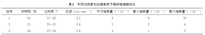 在保護渣對比試驗中,通過固定變量的方式得出對控制增碳較為合適的保護渣成分及理化性能,但在實際生產(chǎn)中,工藝條件往往變化較大,其中過熱度與拉速的變化也會造成板坯增碳。以3號保護渣在連鑄耐材固定條件下為例,挑選不同過熱度與拉速澆鑄的板坯,對其取樣并使用碳硫分析儀檢測碳含量,結(jié)果如表2所示。