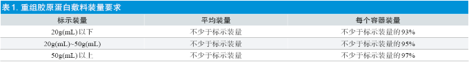 裝量是衡量產(chǎn)品充裝量的指標,不同產(chǎn)品型式的重組膠原蛋白敷料均需要對裝量作出規(guī)定,由于該類產(chǎn)品一般為液體、黏稠液體或半固體,故本標準規(guī)定裝量應(yīng)符合《中華人民共和國藥典》(2020 年版 四部)通則0942 最低裝量檢查法的要求。具體要求見表1。