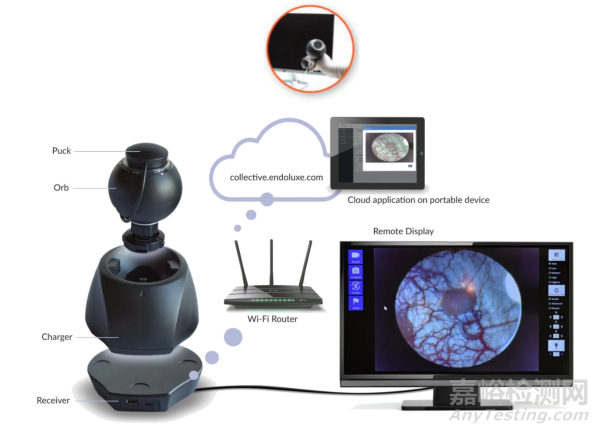Endoluxe eVS平臺由Endoluxe Orb、Endoluxe 接收器和 Endoluxe 充電站組成。endoluxe orb 是一款便攜式智能設備,集成了磁性光源、1080p 高清攝像頭、全觸摸顯示屏以及用于連接領先的剛性或柔性模擬內窺鏡的可靠連接方法。orb 與 Endoluxe 接收器無線通信以捕獲圖像和視頻,同時流式傳輸到任何支持 HDMI 的遠程顯示器或云應用程序。除了這些功能之外,還有一個軟件平臺,它提供 QR 碼集成工作列表、符合 HIPAA 標準的基于云的媒體存儲、共享和流式傳輸,用于文檔、患者教育、轉診和咨詢。