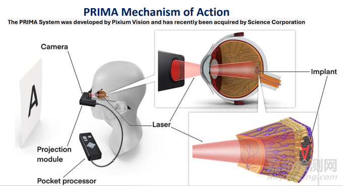 PRIMA 是法國(guó)生物電子公司 Pixium Vision 的明星產(chǎn)品,它是一項(xiàng)創(chuàng)新的視網(wǎng)膜植入技術(shù),旨在作為光感受器的光伏替代品,幫助患有萎縮性干性年齡相關(guān)性黃斑變性(AMD)的患者重獲視力。
