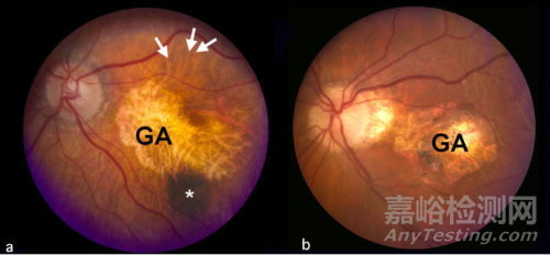 GA是干性年齡相關(guān)性黃斑變性(AMD)的一種晚期形式,其特征是視網(wǎng)膜色素上皮(RPE)細(xì)胞和光感受器細(xì)胞的逐漸退化和丟失,導(dǎo)致視網(wǎng)膜變薄。這種病變通常首先影響黃斑區(qū),這是負(fù)責(zé)中央視力和精細(xì)視覺(jué)的視網(wǎng)膜中心部分。