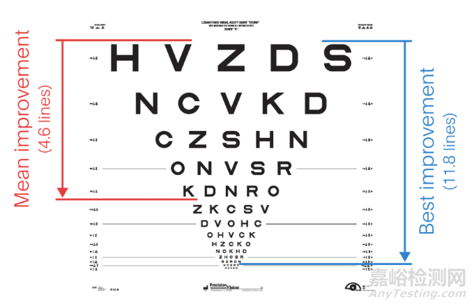 與基線相比,植入后 12 個(gè)月平均改善 23 個(gè)字母(4.6 行)。