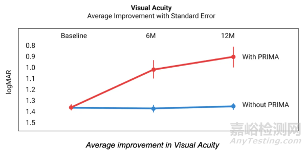 使用 PRIMA 植入物時(shí)的平均視力從 ~1.3 提高到 ~0.9,而未使用植入物的平均視力保持不變,為 ~1.3。