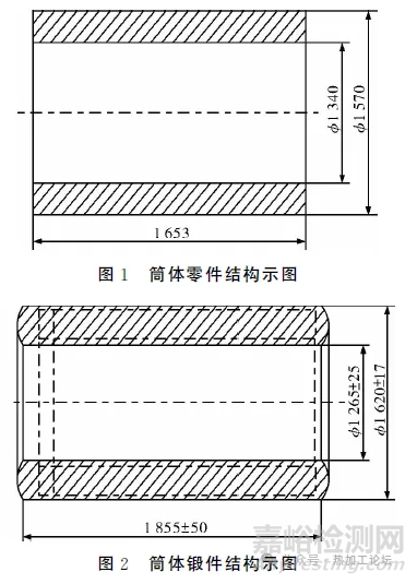 筒體規(guī)格(外徑×內(nèi)徑×長度)Ф1570mm×Ф1340mm×1653mm,結(jié)構(gòu)示意圖見圖1,鍛件結(jié)構(gòu)示意圖見圖2。