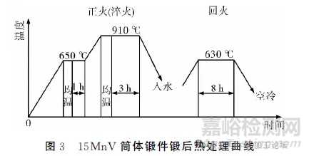 該鍛件鍛后熱處理采用正火+回火。先預(yù)熱到650℃,均溫后保溫1h,再升溫到(910±10)℃,均溫后保溫3h,出爐入水。淬火后進(jìn)行高溫回火處理,回火溫度(630±10)℃,保溫8h,空冷。鍛后熱處理曲線見圖3。
