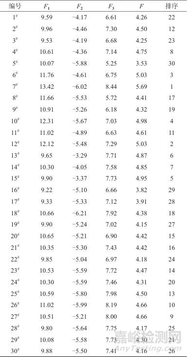 i為表5中不同因子, j = 1、2、3、4、5、6、7。根據(jù)上述3個主成分的方差貢獻(xiàn)率,來建立銀杏葉片品質(zhì)綜合評價模型為F = 30.6% × F1/76.0% + 25.0% × F2/76.0% + 20.4% × F3/76.0%。