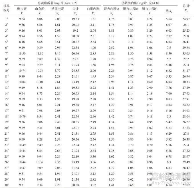 注:總黃酮醇苷Xa=X1+X2+X3,總萜類內(nèi)酯Xb=X4+X5+X6+X7,總計Xz=Xa+Xb。
