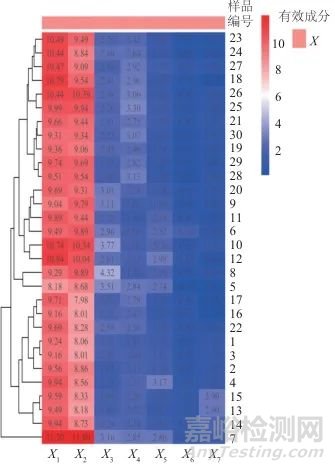 以銀杏葉片中7個有效成分含量測定結(jié)果為變量,運(yùn)用相關(guān)平臺系統(tǒng),選擇Completelinkage法為聚類方法、Squared Euclidean Distance為測量距離方法,在線繪制HeatmapCluster,Cluster是數(shù)據(jù)處理,Heatmap是數(shù)據(jù)展示。對30批銀杏葉片中有效成分含量進(jìn)行系統(tǒng)聚類分析,X軸為不同有效成分、Y軸為樣品編號,結(jié)果見圖1。