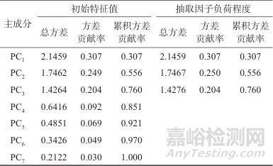 運(yùn)用相關(guān)軟件,對30批銀杏葉片中7個有效成分測得數(shù)據(jù)進(jìn)行主成分分析,各主成分的特征值、方差貢獻(xiàn)率和累積方差貢獻(xiàn)率見表4。