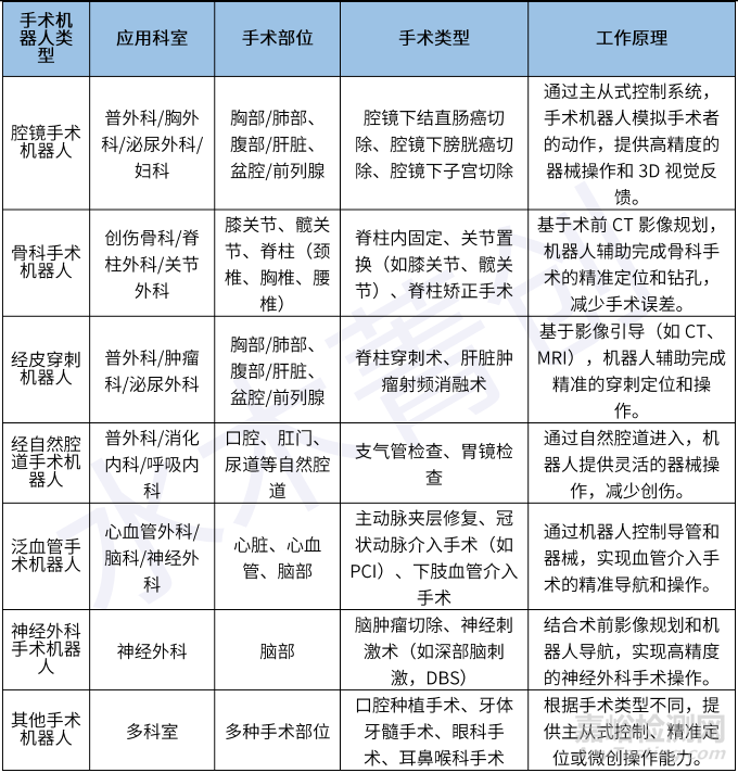 手術(shù)機(jī)器人的發(fā)展可以追溯到20世紀(jì)80年代,早期的機(jī)器人主要用于輔助手術(shù)定位和導(dǎo)航。隨著技術(shù)的進(jìn)步,手術(shù)機(jī)器人逐漸實(shí)現(xiàn)了從輔助工具到獨(dú)立操作平臺(tái)的轉(zhuǎn)變。手術(shù)機(jī)器人根據(jù)應(yīng)用場景和技術(shù)特點(diǎn)可以分為以下幾類[1]: