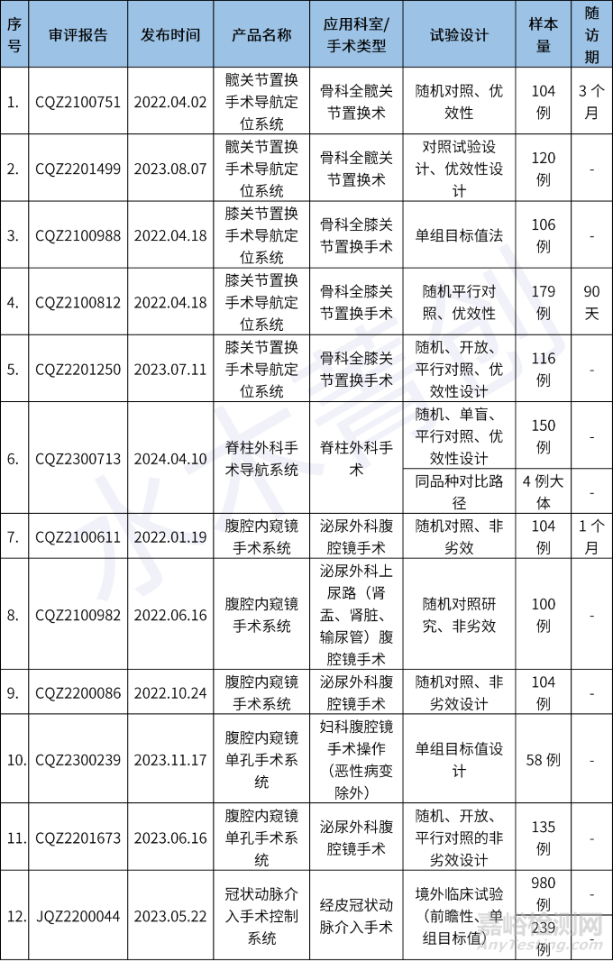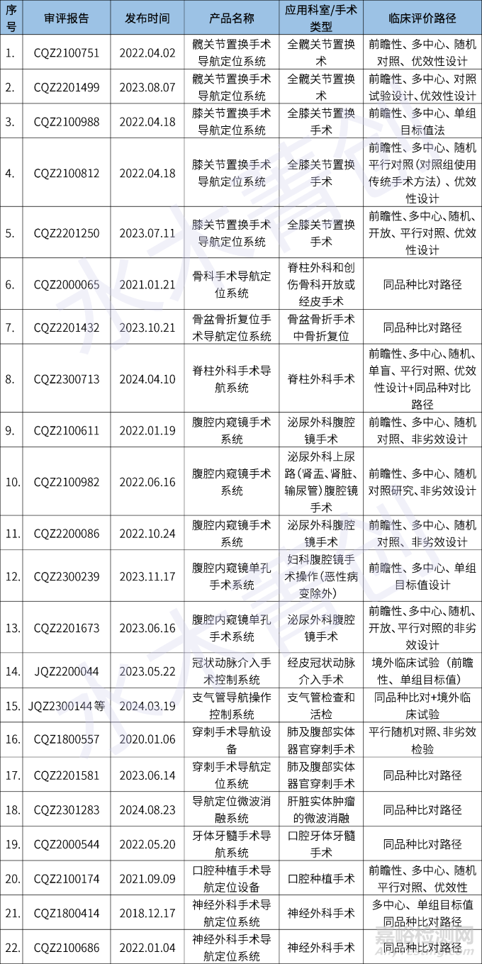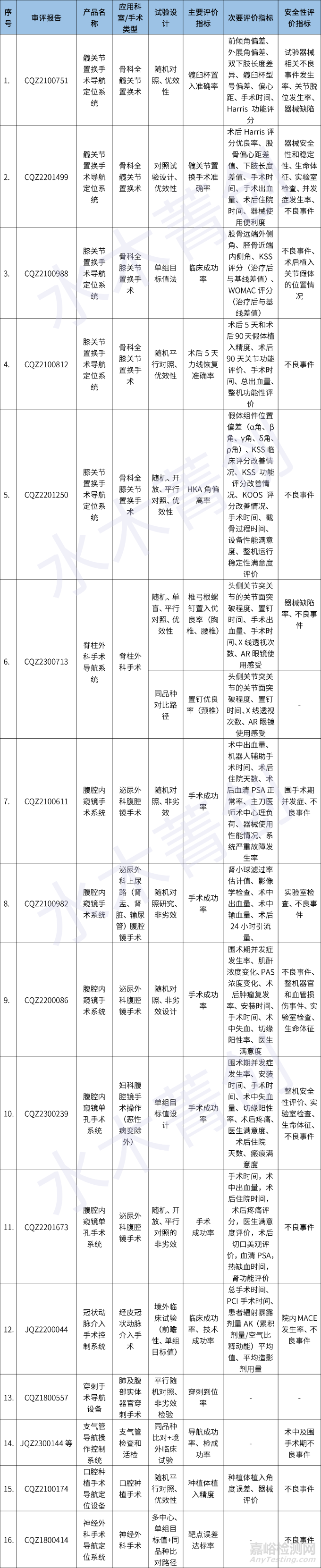 手術(shù)機(jī)器人的臨床試驗(yàn)設(shè)計(jì)是驗(yàn)證其安全性和有效性的關(guān)鍵環(huán)節(jié)。通過在醫(yī)療器械技術(shù)審評中心以“手術(shù)系統(tǒng)”、“控制系統(tǒng)”、“導(dǎo)航定位”、“導(dǎo)航系統(tǒng)”作為關(guān)鍵詞進(jìn)行檢索,匯總了目前境內(nèi)已上市的手術(shù)機(jī)器人類型、臨床評價(jià)路徑、臨床試驗(yàn)設(shè)計(jì)、評價(jià)指標(biāo)、樣本量、隨訪期等內(nèi)容。