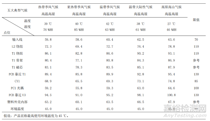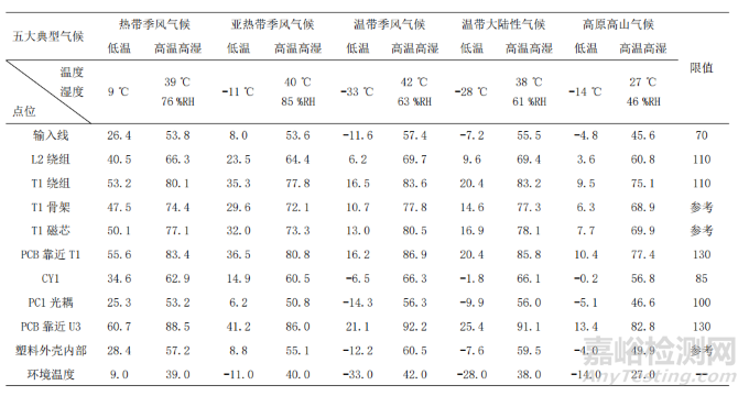 將一個(gè)帶有USB電源的戶外新能源汽車(chē)放電插座在溫帶季風(fēng)氣候、亞熱帶季風(fēng)氣候、熱帶季風(fēng)氣候、溫帶大陸性氣候、高原高山氣候五大典型氣候下模擬相應(yīng)的典型溫度濕度進(jìn)行溫升比對(duì),輸入電壓頻率和帶載情況及擺放情況均相同。