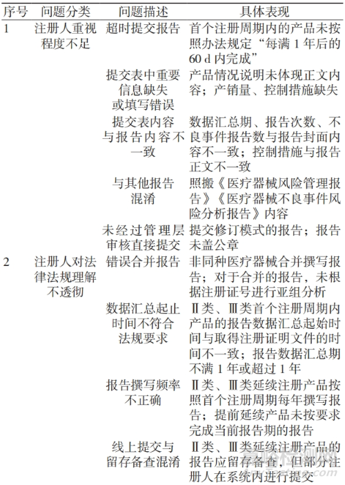 梳理、匯總截至 2023 年 8 月底國家醫(yī)療器械不良事件監(jiān)測信息系統(tǒng)內(nèi)山東省注冊人提交的 6 497 份PRER(Ⅱ類產(chǎn)品 5 387 份,Ⅲ類產(chǎn)品 1 110 份),對審核未通過的報告進(jìn)行分析,發(fā)現(xiàn)問題主要集中在注冊人對 PRER 的重視程度不足、對法律法規(guī)的理解不透徹、報告撰寫能力較低、風(fēng)險意識不到位等問題,具體見表 1。